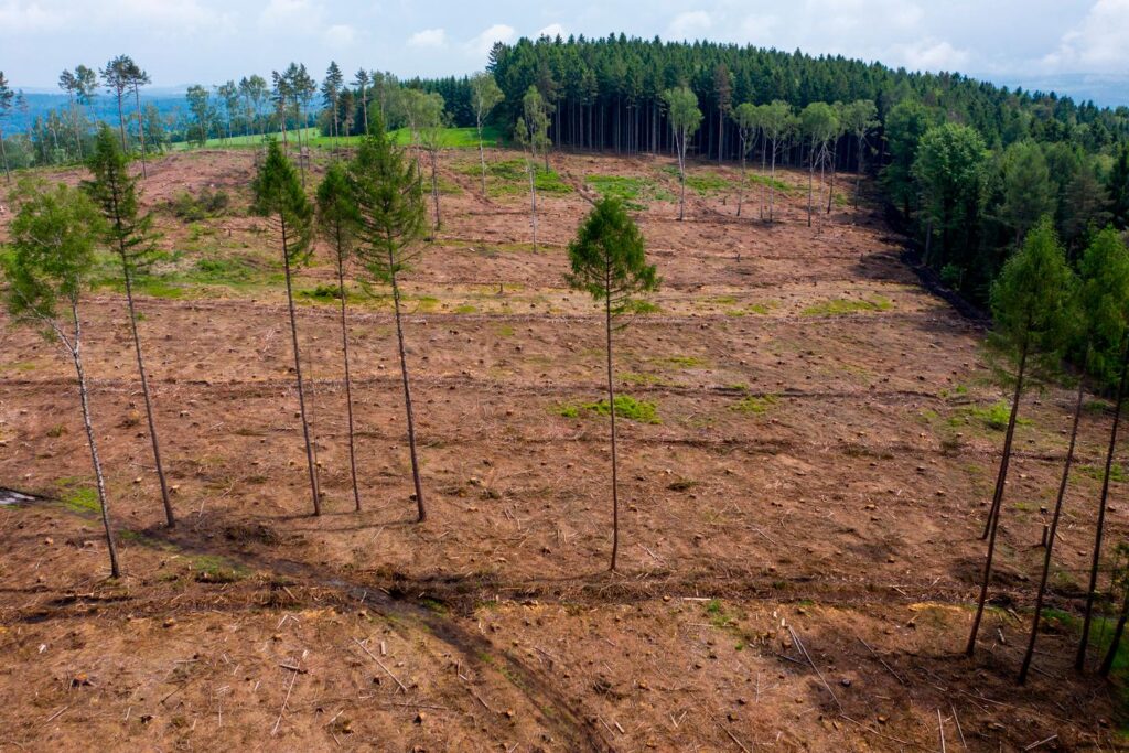 An almost completely bare forest area on a ridge in the Ore Mountains in Saxony, Germany. In recent years, the forest here has been severely