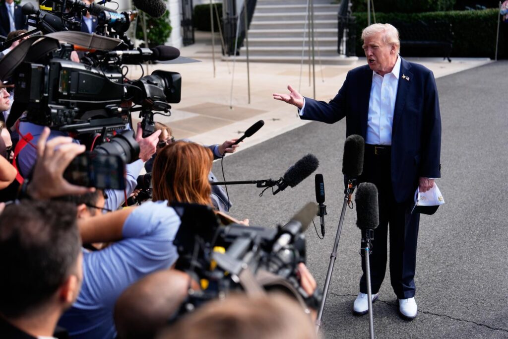 Donald Trump addresses journalists outside the White House, Washington, September 26, 2025. JULIA DEMAREE NIKHINSON / AP Donald Trump approached the small crowd, smiling and