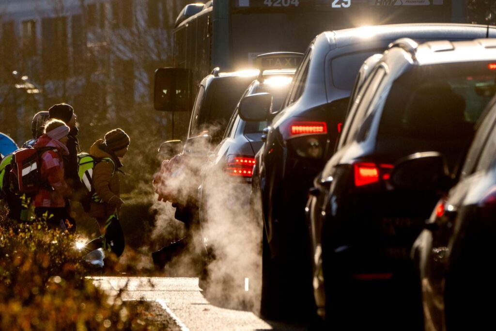 Cars give off exhaust fumes as children head to school in Frankfurt, Germany, on February 27, 2023. MICHAEL PROBST / AP German Chancellor Friedrich Merz