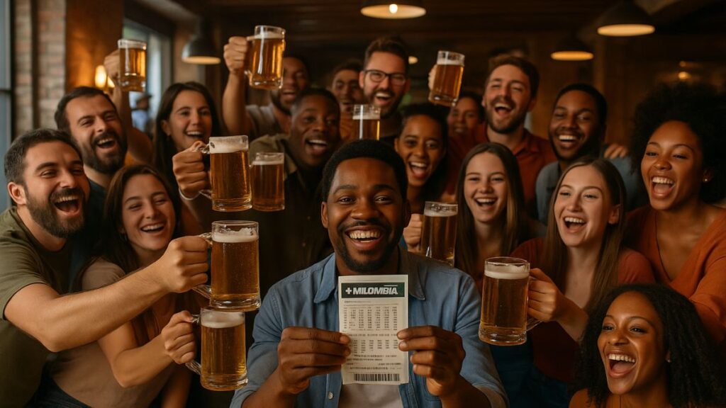 Grupo de amigos comemora prêmio em loteria mais difícil que a Mega-Sena em imagem gerada por IA. Um grupo formado por 24 amigos da