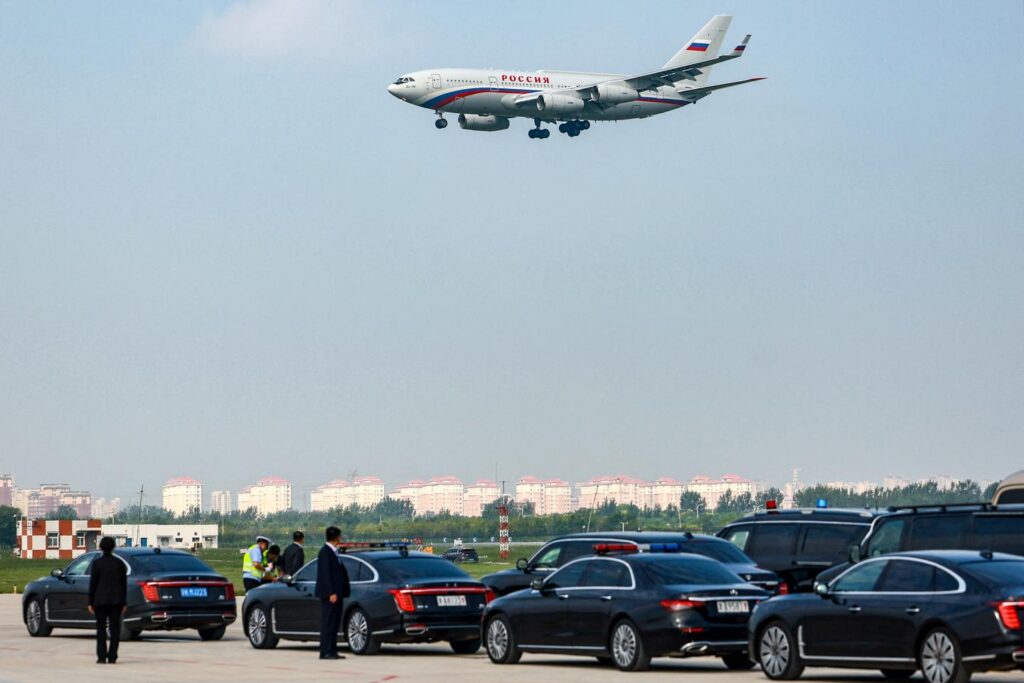 Vladimir Putin’s plane prepares to land as the Russian president arrives for the Shanghai Cooperation Organization (SCO) summit in Tianjin, China, on August 31, 2025.