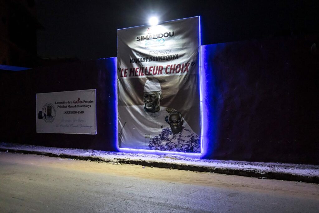 A billboard depicting Guinea President Mamady Doumbouya, with the message “the best choice.” PATRICK MEINHARDT / AFP Guinea’s junta chief Mamady Doumbouya, who had pledged