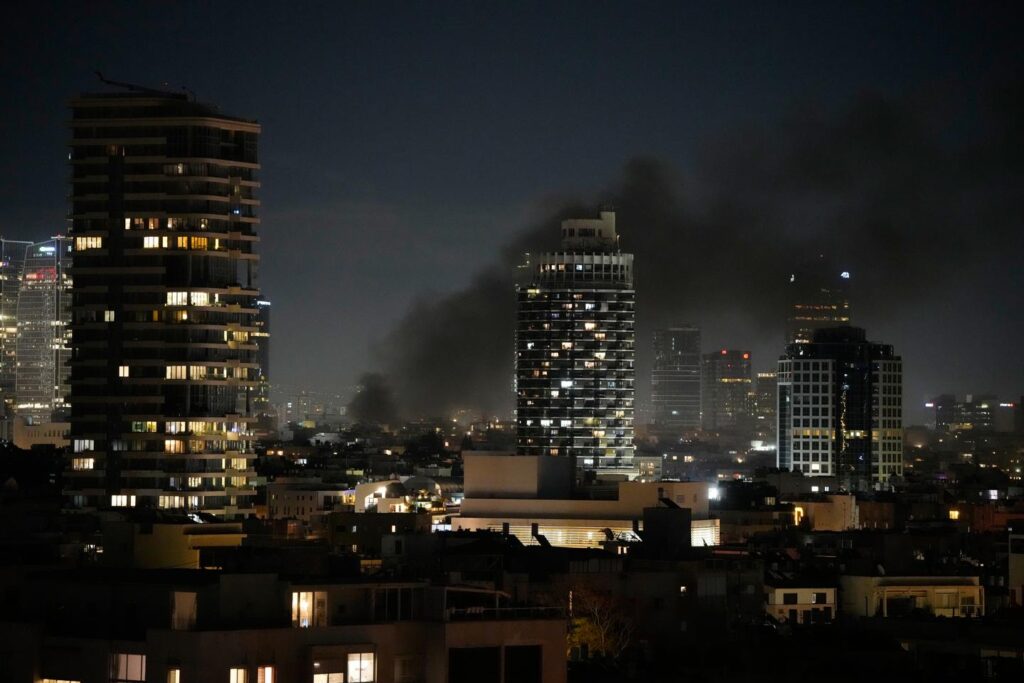 Smoke rises after an Iranian missile attack, Tel Aviv, Israel, February 28, 2026. OHAD ZWIGENBERG / AP First responders said Iranian missile fire killed a