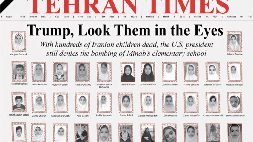 “Tehran Times enfileira 100 retratos de crianças; segundo a publicação, todas são vítimas do ataque à escola em Minab, no sul do país O Tehran