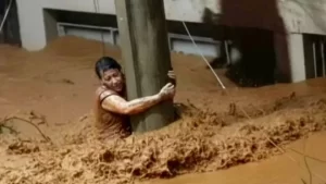 Uma mulher sobreviveu às inundações que estão afetando Minas Gerais depois de ter ficado agarrada a um poste durante
