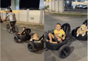 Nessa família ninguém fica de fora mesmo! Um homem muito sagaz improvisa um trenzinho para conseguir levar o filho