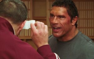 Uma marca de tiro feita de pintura corporal e eletrochoques simbolizados por lantejoulas prateadas na perna de pau eram parte