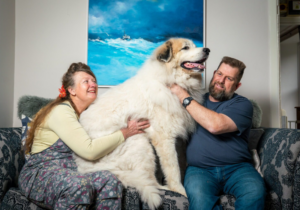 Ele é lindo demais! Uma família adotou um cão enorme e branquinho, parecendo um urso polar de tão fofo