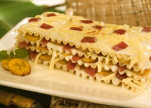 A combinação tropical da Lasanha de banana com queijo e goiabada, surpreende pelo equilíbrio entre o doce e