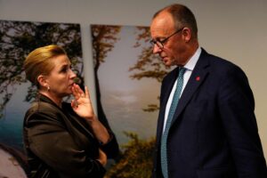 Danish Prime Minister Mette Frederiksen and German Chancellor Friedrich Merz in Copenhagen, on October 2, 2025. MADS CLAUS RASMUSSEN/RITZAU