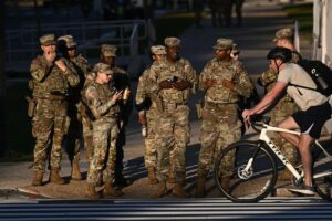 Members of the National Guard patrol along the National Mall on the first day of the US government shutdown