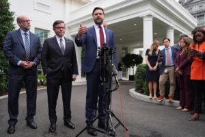 Vice President JD Vance, from right, House Speaker Mike Johnson, R-La., and Russell Vought, Office of Management and Budget