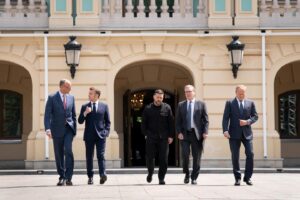 German Chancellor Friedrich Merz, French President Emmanuel Macron, Ukrainian President Volodymyr Zelensky, British Prime Minister Keir Starmer and Polish