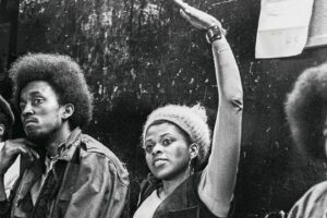 Assata Shakur raises her hand in a Black Panther political education class at the Harlem office, New York, 1970.