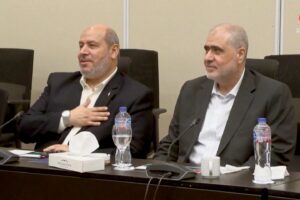 Left, Khalil Al-Hayya, Hamas’s chief negotiator, during a meeting with Egyptian, Qatari and Turkish delegations prior to the announcement