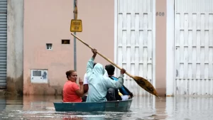 Volunteers carry groceries in a flooded area after Storm Leonardo passed by Alcacer do Sal, Portugal, February 5, 2026.