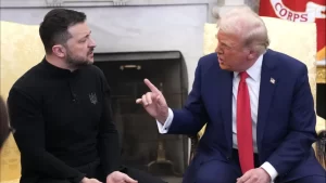 Ukrainian President Volodymyr Zelensky, looks back at the media in Downing Street, London, on December 8, 2025. KIN CHEUNG