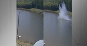 As imagens de uma câmera de segurança registraram o momento exato em que um helicóptero caiu em um lago