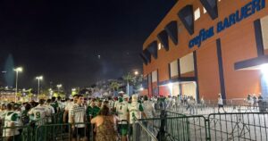 Parte da torcida que se deslocou até a Arena Crefisa Barueri, palco do jogo de ida da decisão do